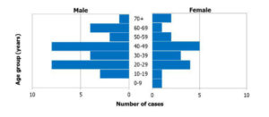 図2:2018年4月4日から6月3日の間にエボラウイルス病の確定例、ほぼ確実例の年齢と性別による分布(n=49)
