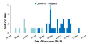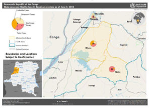 2018年4月4日から6月3日まで、赤道(Equateur)州の3つの保健医療圏から25人の死亡(死亡率= 45%)を含む合計56件(うち確定37例、ほぼ確実13例、疑い6例)のエボラウイルス病の症例が報告されています。各保健医療圏別の内訳は、ビコロ(Bikoro) 26例(うち確定10例、ほぼ確実11例、疑い5例)、イボコ 25例(うち確定23例、ほぼ確実2例)、ワンガタ(Wangata) 5例(うち確定4例、疑い1例)です。医療従事者の感染例も5例が報告されています。