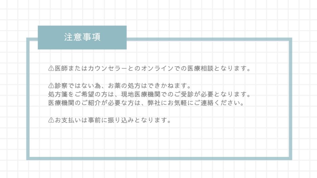 - カウンセリングご希望の方は、日本人医師のオンライン診察を承ります。